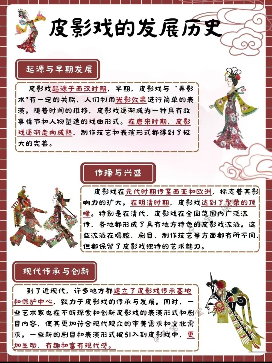 2006年,皮影戏被列入首批国家级非物质文化遗产名录;2011年,入选联合国教科文组织人类非物质文化遗产代表作名录,正式走向世界舞台。如今,传统皮影戏正以创新姿态传承发展,艺人们结合现代动画技术、新媒体平台,推出动漫主题皮影、沉浸式皮影演出等新形式,同时通过文创开发、校园课程推广,让更多年轻人了解、爱上这一古老艺术,让千年灯影在新时代继续焕发光彩。