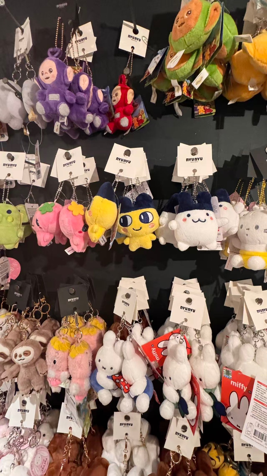 今天逛文创店,直接被一整墙的毛绒挂件戳中了心巴!抬头望去,密密麻麻的可爱玩偶挂在墙上,每一个都软乎乎的,颜值超高。有天线宝宝系列,紫色的丁丁、红色的小波,圆滚滚的超萌;还有卡通形象,粉色的草莓玩偶、黄色的拓麻歌子、软萌的兔子,每一个都长在我的审美上。