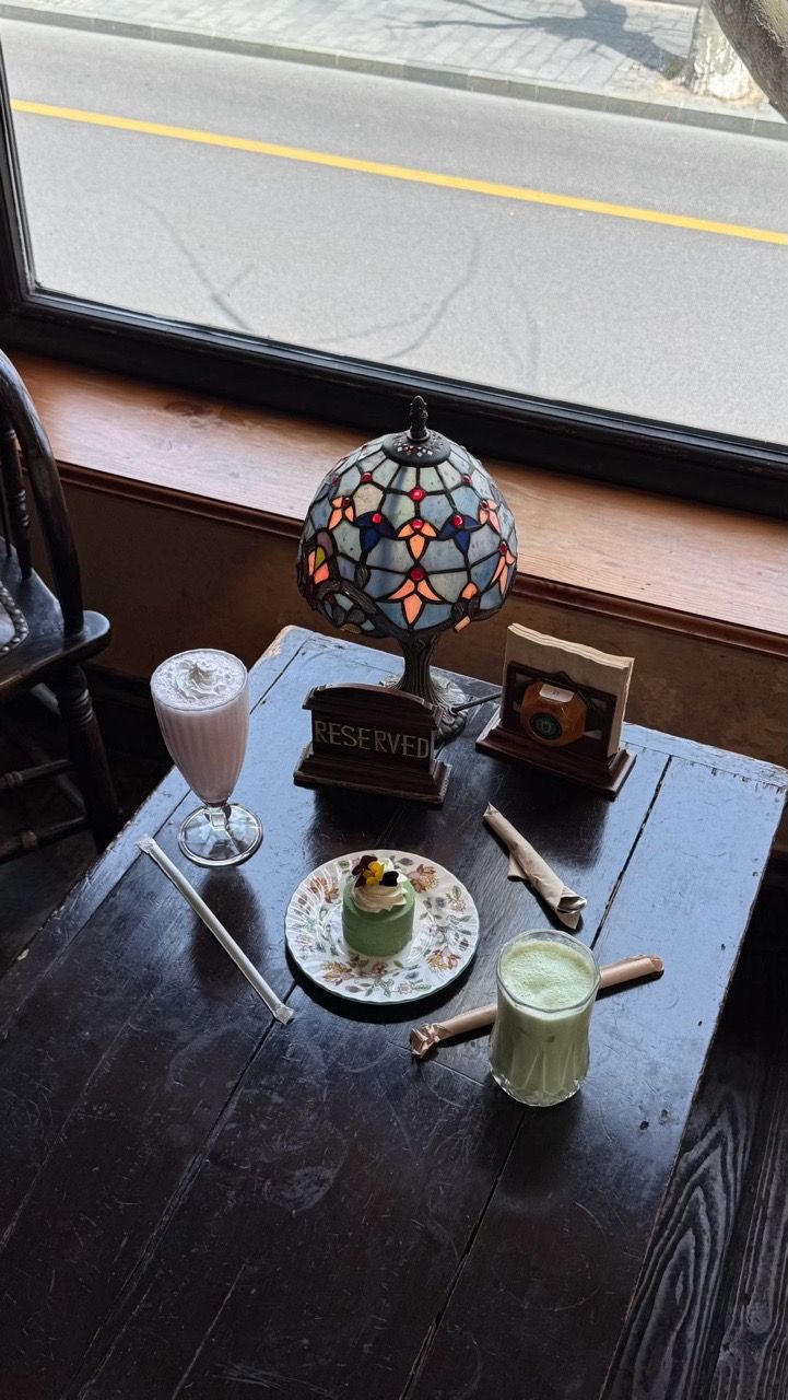 桌上的“RESERVED”牌子仿佛在宣告这是专属的美好时光,窗外的马路安静延伸,阳光透过玻璃洒在桌面上,把每一件小物都镀上了金色的光晕。在这里,时间好像都慢了下来,不用赶路,不用匆忙,只是静静地坐着,看着光影移动,品尝着舌尖的甜。