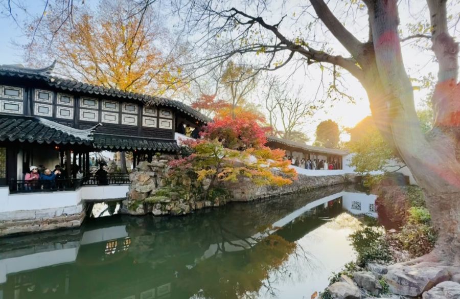 错落有致,移步换景,此处一景,换一处又是一景,此处景色还在回味,不远处又是别样的长廊,别样的楼阁,或大或小,尽显别致,而银杏,枫叶穷尽此秋而点缀其间,红橙黄深秋颜色以灰瓦红漆的气势恢宏建筑为背景为依托,增加了不少色彩和亮点,引得游人纷纷驻足,打卡拍照,心想,古代江南熙熙攘攘的时刻,他们怎样记录这样的时刻,和如此的美景呢?做诗写赋,也许这就是那个时代文化发展到顶峰的原因吧,用手机就可以记录这美妙的瞬间