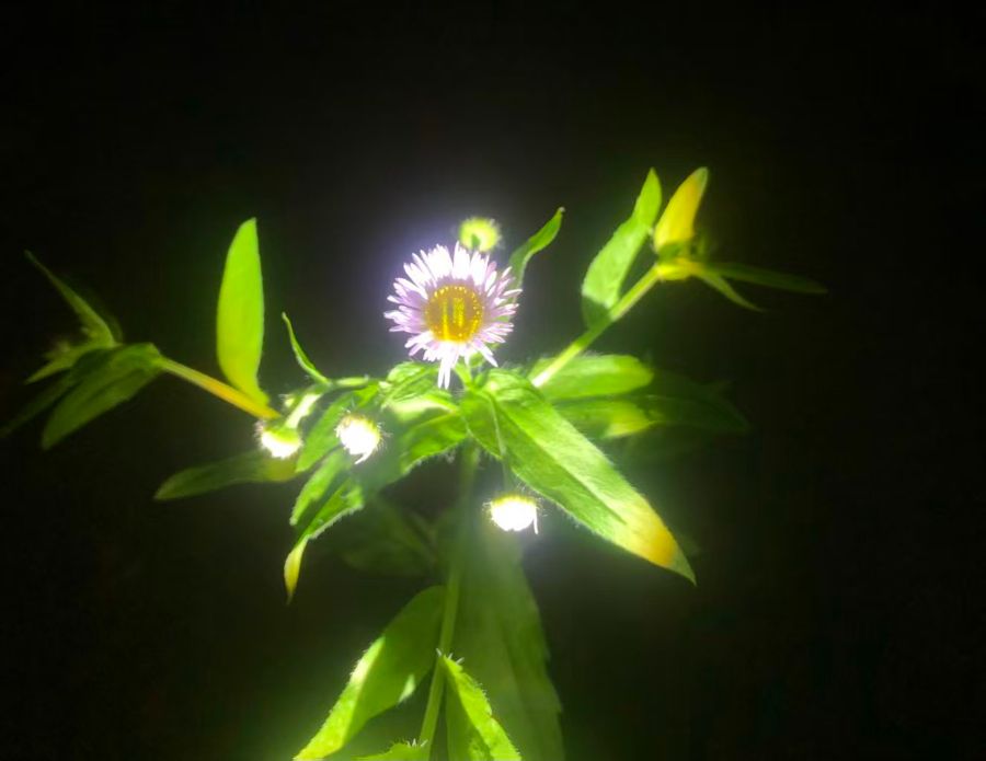 深夜的户外,手机的灯光意外捕捉到了这株一年蓬。漆黑的背景里,它成了唯一的焦点,淡紫色的舌状花围绕着明黄的花心,叶片上的细毛在强光下清晰可见,边缘的齿痕也被勾勒得格外分明。
