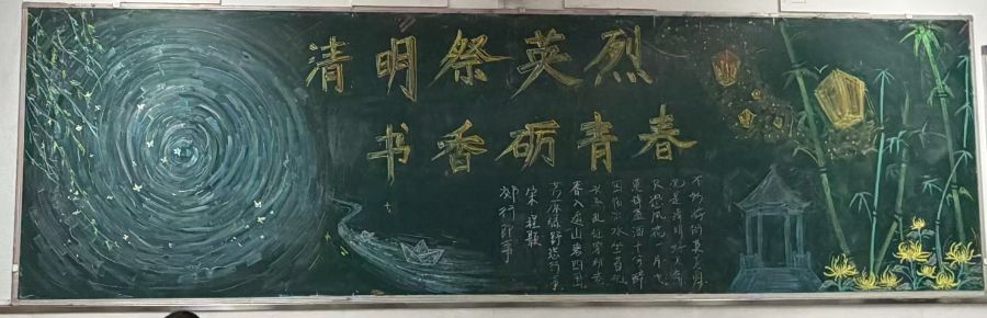 清明节,追思寄先烈,书香润青春。班级精心绘制了以“清明祭英烈,书香砺青春”为主题的黑板报,黑板整体配色庄重肃穆,左侧水波涟漪搭配依依垂柳,氛围感拉满;右侧青竹挺立、亭台静立、黄花盛放、灯笼点点,尽显缅怀与敬意。