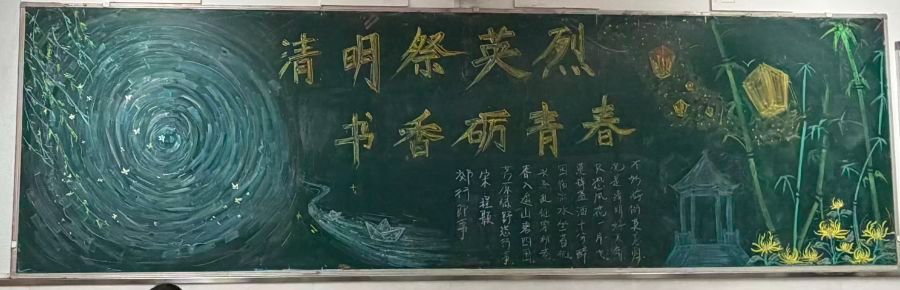 左畔的涟漪里,纸船载着星光,像载着对英烈的遥寄;右侧竹影摇风,亭台静立,孔明灯的暖光与黄菊的清芳,是永不褪色的敬意。我们缅怀英烈,也追问自己:青春怎样不负热血?英烈已逝,精神永存。他们留下的不只是故事,更是信念的火种。而火种的传递,需要书籍滋养、知识照亮。书香里的青春,才是有根的青春用金色粉笔郑重书写,像一句跨越时空的誓言。左侧晕染的墨色漩涡里,柳枝垂落,纸船浮在水波上清明祭英烈,书香砺青春四月的风,携着追思,也翻动着书页。清明祭英烈——我们从未忘记,那些用生命换来山河无恙的名字。没有他们的热血,便没有此刻窗外的朗朗书声。