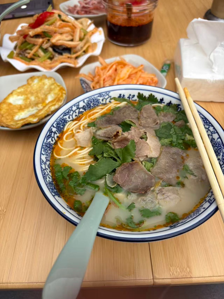 先喝一口汤——浓郁的肉香在口中散开,带着八角、桂皮等香料的复合味道,暖意从喉咙一路蔓延到胃里。再挑起一筷子面,滑溜溜地吸入口中,劲道爽滑,嚼起来有淡淡的面香。牛肉入口即化,丝丝分明,咸鲜的酱汁渗进每一丝纤维里。
